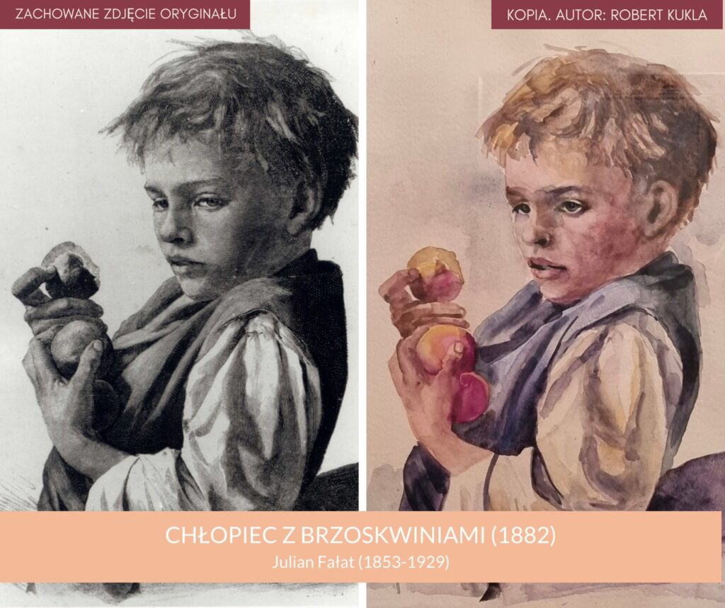W naszej Galerii Dzieł Utraconych zawisła kolejna kopia zaginionego dzieła. Tym razem nasz zaprzyjaźniony artysta Robert Kukla odtworzył „Chłopca z brzoskwiniami” autorstwa Juliana Fałata. Obraz wisiał w Galerii Raczyńskich w Rogalinie. Rok przed II wojną światową trafił do Muzeum Narodowego w Warszawie. Niestety, wraz z innymi obrazami z Rogalina, które trafiły do MNW, został wywieziony przez Niemców na Śląsk. Po wojnie połakomiła się na nie Armia Czerwona. W 1956 roku niektóre z nich wróciły do Polski, niestety nie było wśród nich „Chłopca z Brzoskwiniami”.