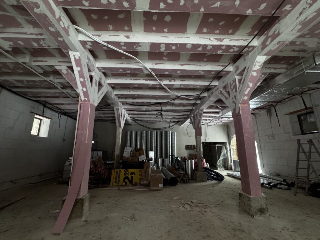 Stodoła to miejsce, w którym pozostało bardzo dużo elementów drewnianych, i to w bardzo dobrym stanie. Nie chcemy się ich pozbywać, ale ze względu na przepisy przeciwpożarowe część z nich musieliśmy zabezpieczyć specjalnymi ognioodpornymi okładzinami. Dzięki temu nasza kuchnia i restauracja będą spełniać wszystkie normy.